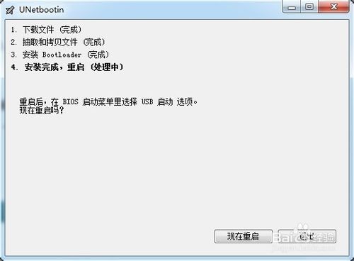 軟件提示要求重啟系統(tǒng),進入bios設(shè)置,然后就能用U盤引導(dǎo)系統(tǒng)了。