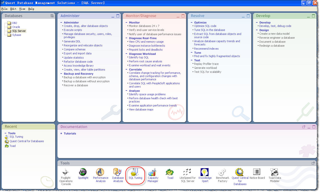 SQL Turning 是Quest公司出品的Quest Central軟件中的一個(gè)工具。Quest Central是一款集成化、圖形化、跨平臺(tái)的數(shù)據(jù)庫管理解決方案,可以同時(shí)管理 Oracle、DB2 和 SQL server 數(shù)據(jù)庫。