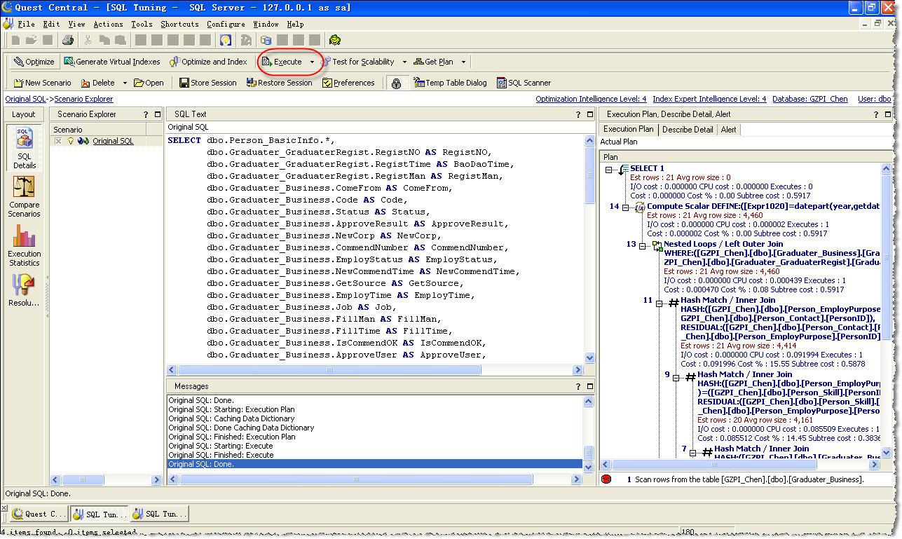 然后點(diǎn)擊工具欄上的“Execute”按鈕,執(zhí)行原始的SQL語句,SQL Tuning會(huì)自動(dòng)分析SQL的執(zhí)行計(jì)劃,并把分析結(jié)果顯示到界面上(圖5)。
