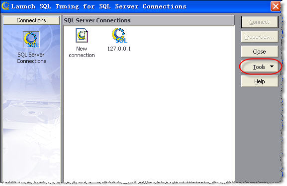 在Quest Central主界面上的“Database”樹上選擇“SQL Server”,然后在下方出現(xiàn)的“Tools”框中選擇“SQL Tuning”選項(xiàng),打開“Lanch SQL Tuning for SQL Server Connections”對(duì)話框(圖2、圖3)。我們在這里建立數(shù)據(jù)庫服務(wù)器的連接,以后的分析工作都會(huì)在它上面完成。