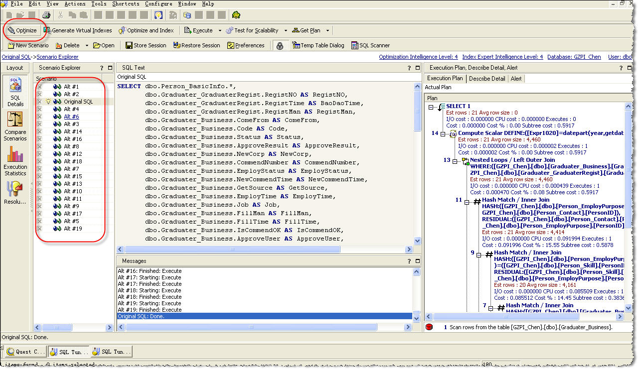 現(xiàn)在我們點(diǎn)擊工具欄上的“Optimize Statement”按鈕,讓SQL Tuning開始優(yōu)化SQL,完成后,可以看到SQL Tuning產(chǎn)生了19條與原始SQL等價(jià)的優(yōu)化方案(圖6)。