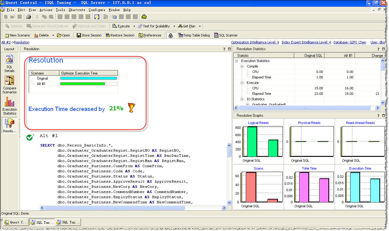 接下來,我們來執(zhí)行上面產(chǎn)生的優(yōu)化方案,以選出性能最佳的等效SQL語句。在列表中選擇需要執(zhí)行的優(yōu)化方案(默認(rèn)已全部選中),然后點(diǎn)擊工具欄上的“Execute”按鈕旁邊的下拉菜單,選擇“Execute Selected”。等到所有SQL運(yùn)行完成后,點(diǎn)擊界面左方的“Tuning Resolution”按鈕,