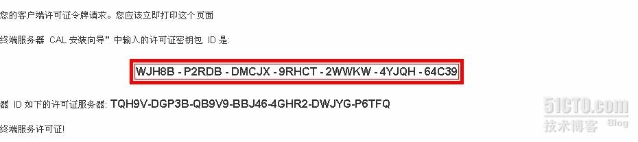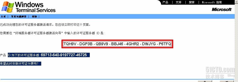 10)現(xiàn)在應(yīng)該是"謝謝您激活終端服務(wù)許可證"的時(shí)候了!你的收獲包括兩個(gè)東東,一個(gè)是剛才已經(jīng)得到的那個(gè)35位數(shù)的"許可證服務(wù)器ID",一個(gè)是現(xiàn)在才取得的另一個(gè)七段共35位數(shù)的"許可證密鑰包ID"。恭喜你!