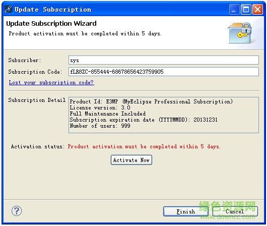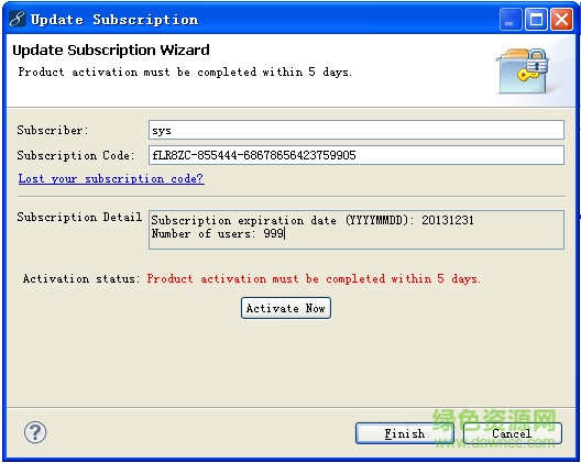 第7步:將注冊機中的 Subscription 值拷貝到下面窗口的SubscriptionCode中。然后點擊【Activate Now】