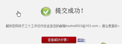5、提交成功后將返回如下界面,后面的而事情就是等待華為把解鎖碼發(fā)送到你的郵箱。