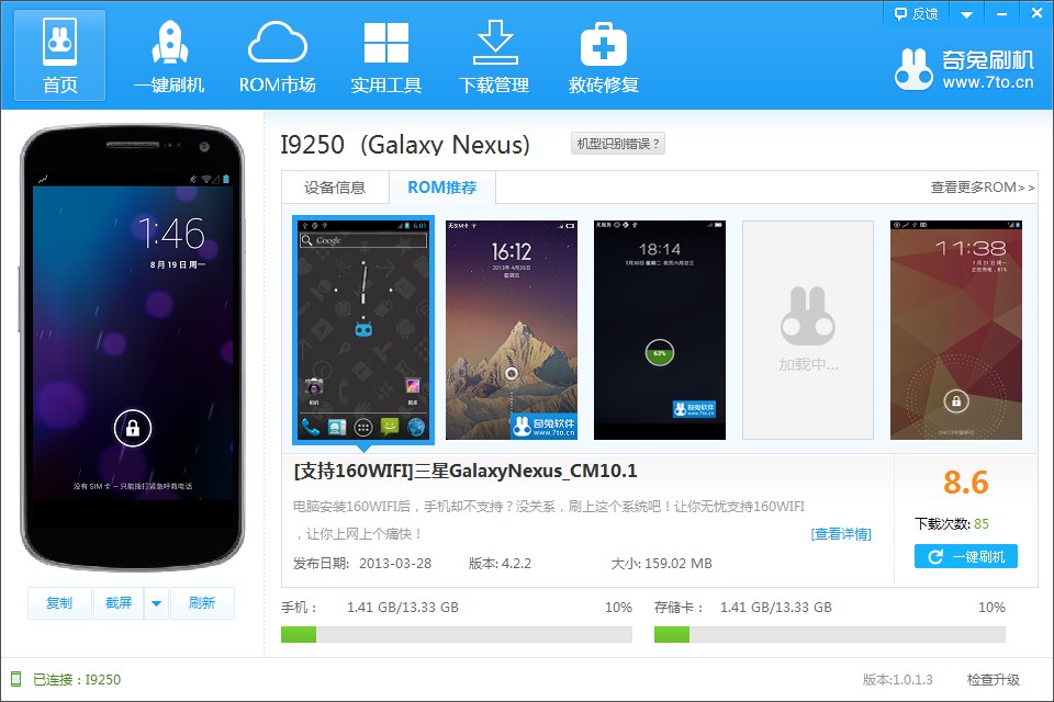 1、下載安裝之后,打開軟件,手機連接電腦,奇兔刷機會自動安裝您手機驅(qū)動并自動識別手機型號,以三星I9250為例,如圖: