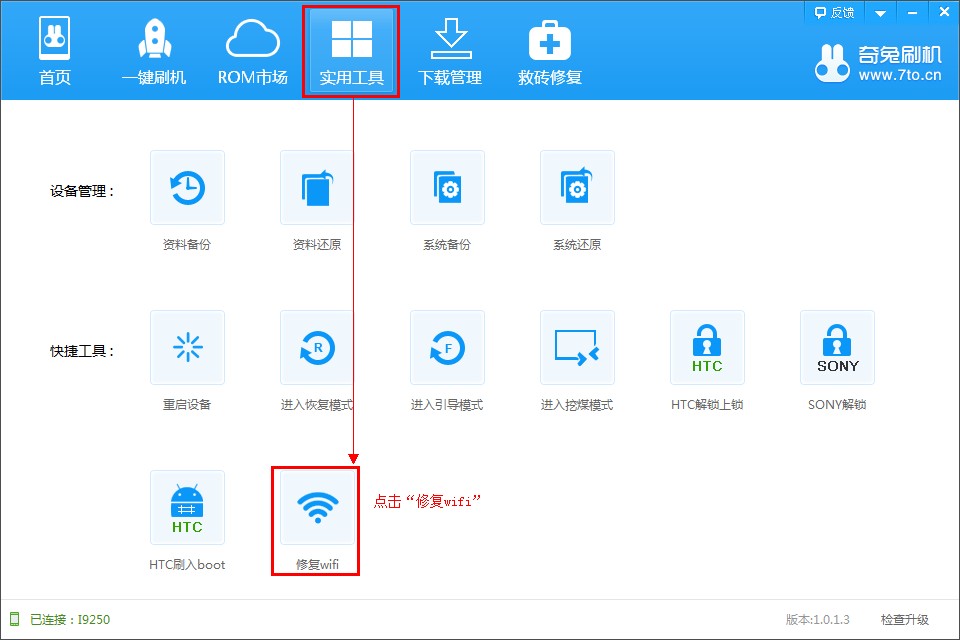 2、機型識別成功后,打開軟件的“實用工具”并點擊“修復(fù)WiFi”功能,如圖: