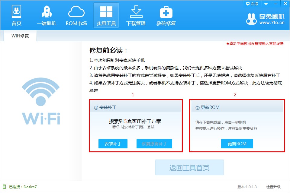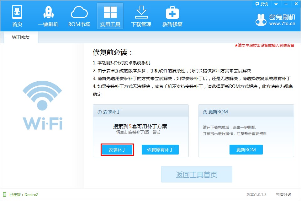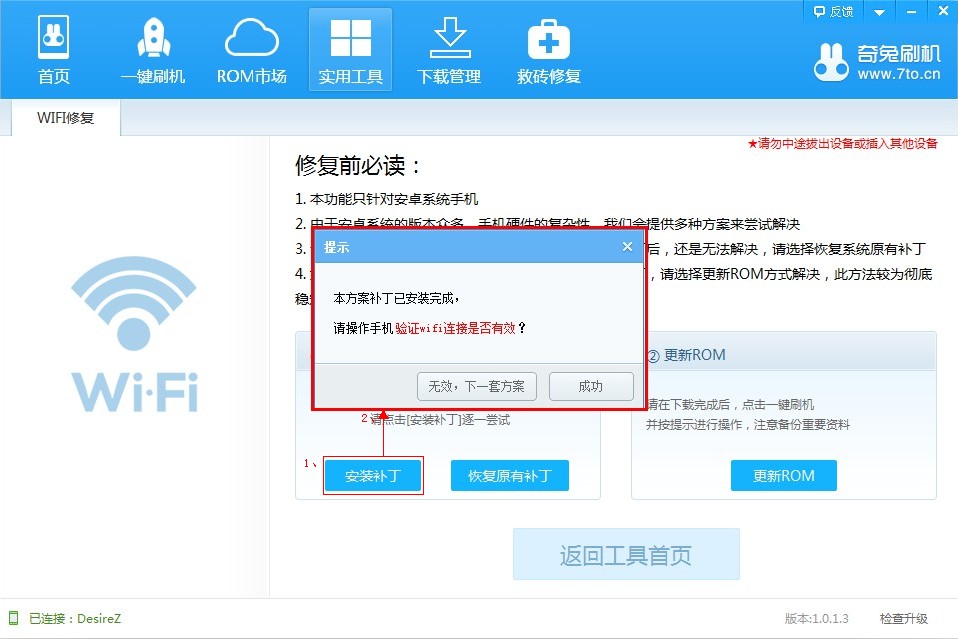Ps.如WiFi還是未連接成功,可點擊“無效,下一套方案”繼續(xù)修復(fù),如軟件提供的補丁方案都未能成功修復(fù),用戶可隨時“恢復(fù)原有補丁”,并嘗試第二種修復(fù)方案,即“更新ROM”方案。