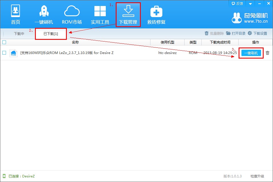 3、ROM包安裝完成后,依次打開“下載管理”— “已下載”最后點擊 “一鍵刷機”,如圖: