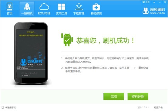 PS.使用“更新ROM”修復(fù)功能前,請確保手機已內(nèi)置SD卡,以保證ROM包能成功刷入您手機。當軟件提示如上圖“恭喜您,刷機成功!”后,手機端還需要跑完剩余的刷機流程,此時,請不要慌張,等待手機跑完流程便會自動重新開機,這時,恭喜您,修復(fù)WIFI成功了!