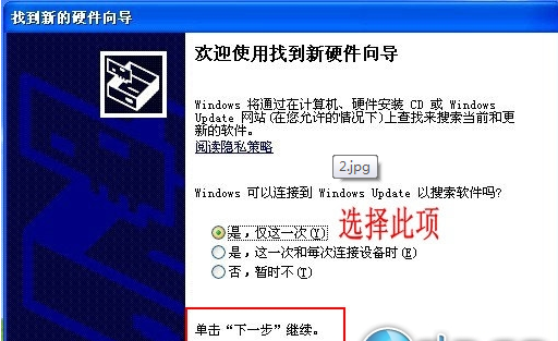 5.彈出新硬件安裝窗口,我們來選擇第一項,是,僅這一次,然后單擊下一步繼續(xù)