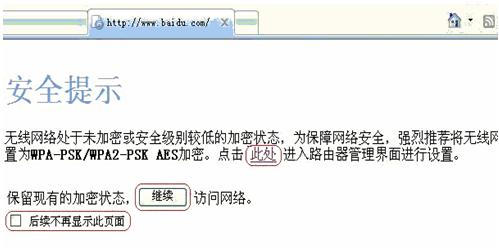2. 如果當(dāng)前無(wú)線設(shè)置加密類型為非WPA-PSK/WPA2-PSK AES 加密,您打開網(wǎng)頁(yè)時(shí)會(huì)彈出如下界面。