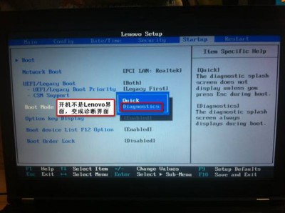 進(jìn)入BIOS,Startup選項(xiàng)下的Boot Mode,如果選擇Diagnostics,開(kāi)機(jī)界面不是聯(lián)想Logo,變成硬件診斷界面;