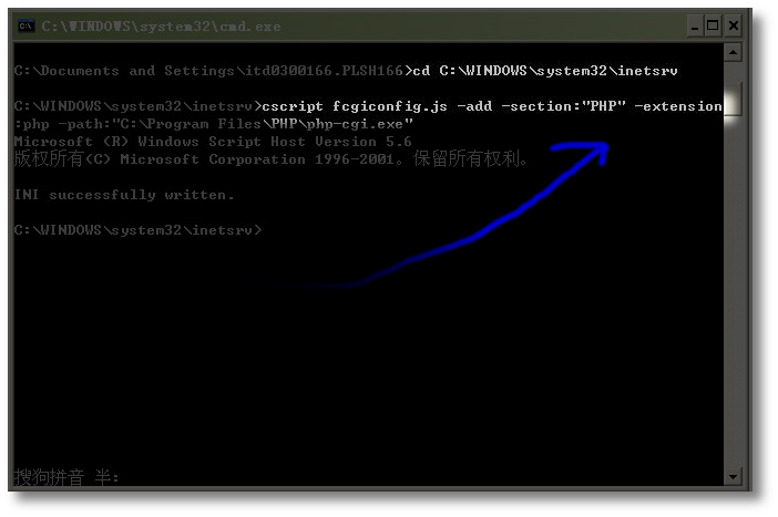 >cscript fcgiconfig.js -add -section:"PHP" -extension:php -path:"C:\Program Files\PHP\php-cgi.exe"