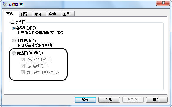 1、在“常規(guī)”選項(xiàng)卡上,單擊“有選擇的啟動(dòng)”。