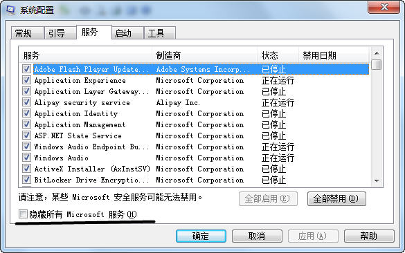 3、單擊“服務(wù)”選項(xiàng)卡,單擊以選擇“隱藏所有 Microsoft服務(wù)”復(fù)選框,然后單擊“全部禁用”。