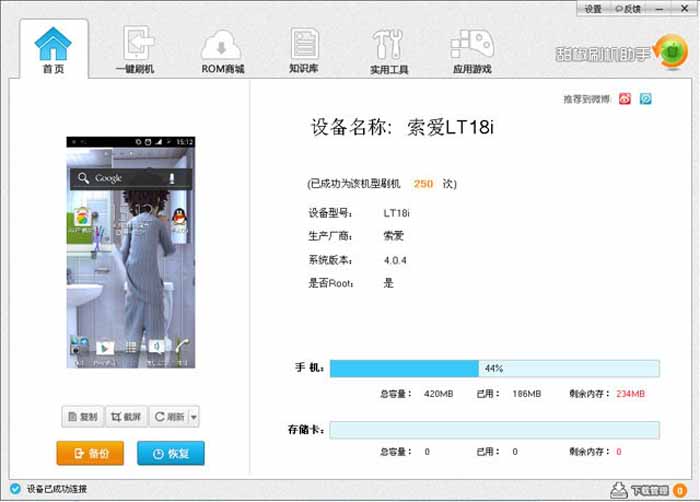 第四步、看你的手機是否ROOT了,如果還沒有ROOT的,就打開實用工具,用永久ROOT或者臨時ROOT都不影響刷機,都可交換試下。ROOT若失敗,請多嘗試幾次。再不行,那么你的手機就比較有個性了,非得手動ROOT不可。(進(jìn)入“知識庫”,找到你的機型,就看到如何手動ROOT了,ROOT工具用不了的,才使用手動,這里不多講)