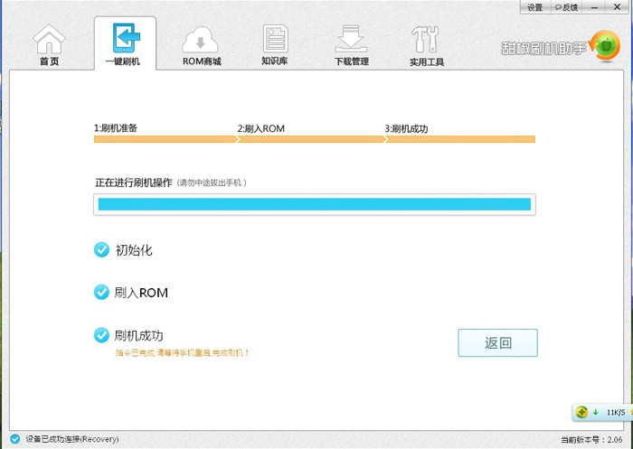 七、進(jìn)入刷機畫面后,甜椒刷機助手會全自動刷入系統(tǒng),等待10多分鐘的進(jìn)程,直到自動重啟,刷機完成成功。
