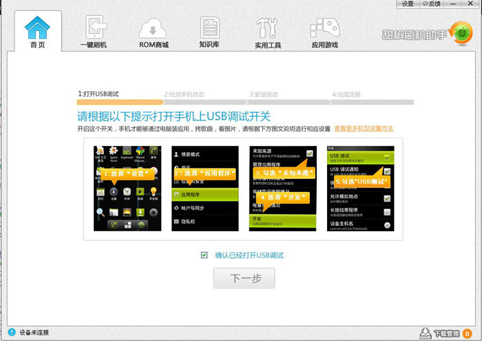 第二步、看下手機設(shè)置是否正確(打開手機設(shè)置→應(yīng)用→安裝開發(fā)調(diào)試,開啟USB調(diào)試),并通過usb 連接電腦,這時甜椒就會自動監(jiān)測手機驅(qū)動、usb驅(qū)動。按照提示點擊鼠標(biāo)就行了,簡單到極點了。