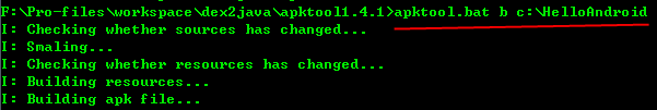 將反編譯完的文件重新打包成apk,很簡(jiǎn)單,輸入apktool.bat b abc123(你編譯出來(lái)文件夾)即可,命令如下: