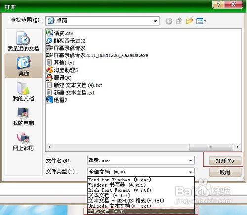 在文件類型下選擇全部文檔,選取要打開的.CSV文件,點擊打開。