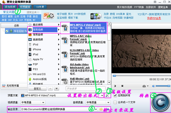 ②設(shè)置輸出格式,在上拉框中選擇:常用視頻--→MP4 即可;