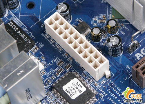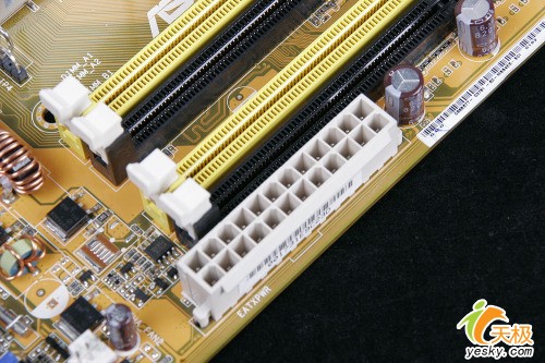 在主板上,我們可以看到一個(gè)長(zhǎng)方形的插槽,這個(gè)插槽就是電源為主板提供供電的插槽(如下圖)。目前主板供電的接口主要有24針與 20針兩種,在中高端的主板上,一般都采用24PIN的主板供電接口設(shè)計(jì),低端的產(chǎn)品一般為20PIN。不論采用24PIN和20PIN,其插法都是一樣的 。
