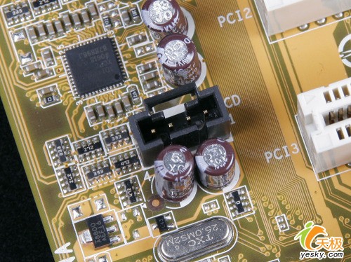 另外,在主板上我們還會(huì)發(fā)現(xiàn)上圖中這樣的接口,這也是音頻接口,不過(guò)對(duì)應(yīng)的是光驅(qū)背部的音頻接口。在某些支持不開(kāi)機(jī)聽(tīng)音樂(lè)的電源,我們連接此音頻線后即可以利用光驅(qū)的前面板上的耳機(jī)來(lái)聽(tīng)音樂(lè),不過(guò)目前這一功能并不常用,大部分機(jī)器并不支持這一功能,因此可以不用連接。