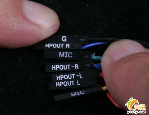 上圖為機(jī)箱前置音頻插孔與主板相連接的擴(kuò)展插口,前置的音頻接口一般為雙聲道,L表示左聲道,R表示右聲道。其中MIC為前置的話筒接口,對(duì)應(yīng)主板上的MIC,HPOUT-L為左聲道輸出,對(duì)應(yīng)主板上的HP-L或Line out-L(視采用的音頻規(guī)范不同,如采用的是ADA音效規(guī)范,則接HP-L,下同),HPOUT-R為右聲道輸出,對(duì)應(yīng)主板上的HP-R或Line out-R,按照分別對(duì)應(yīng)的接口依次接入即可。