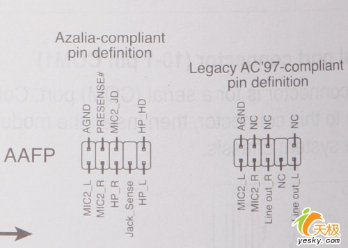 上圖中便是擴(kuò)展的音頻接口。其中AAFP為符合AC97’音效的前置音頻接口,ADH為符合ADA音效的擴(kuò)展音頻接口,SPDIF_OUT是同軸音頻接口,這里,我們重點(diǎn)介紹一下前置音頻接的安裝方法(見(jiàn)下圖)。