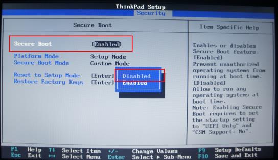 1. 在Security標(biāo)簽下找到Secure Boot選項(xiàng),回車(chē)進(jìn)入,把第一項(xiàng)Secure Boot從“Enabled”切換為“Disabled”;