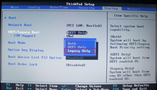 2. 按ESC鍵回退到主界面,在Startup標(biāo)簽下找到UEFI/Legacy Boot選項(xiàng),把默認(rèn)狀態(tài)UEFI Only改成Legacy Only;