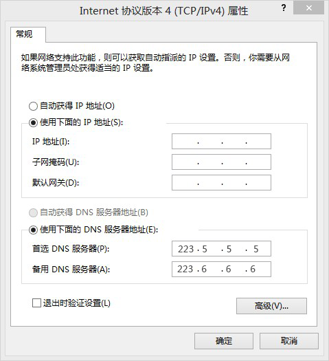 選擇使用指定的DNS,在DNS服務(wù)器地址中輸入223.5.5.5 和 223.6.6.6,輸入后確定退出即設(shè)置完成。
