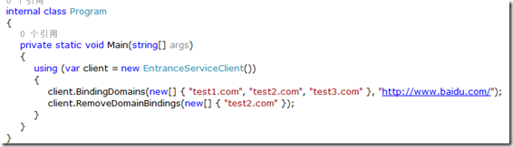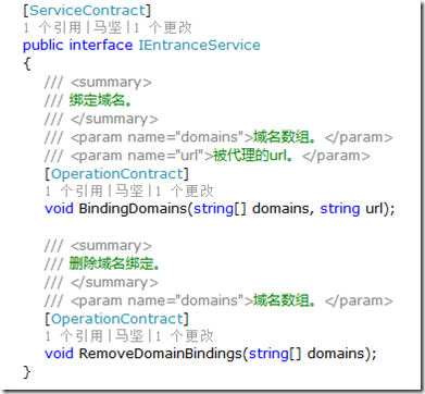 守護(hù)服務(wù)的主要原理是這樣的,守護(hù)服務(wù)提供一個(gè)WCF服務(wù),這個(gè)WCF服務(wù)中有兩個(gè)操作,綁定域名和刪除域名,服務(wù)約束如下: