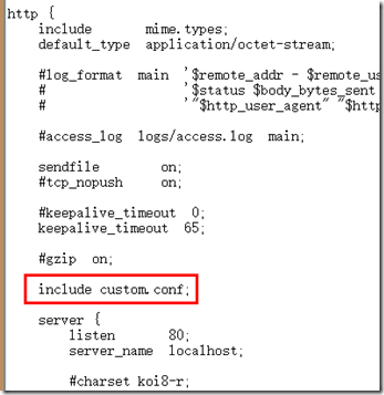 打開nginx-1.7.2\conf\nginx.conf文件,在http節(jié)點(diǎn)下添加配置 include custom.conf;