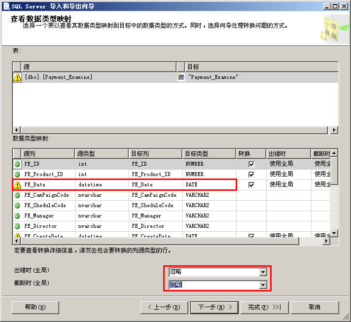 5.這里的datetime轉(zhuǎn)成date是有警告的,不過沒關(guān)系,然后可以忽略出錯與截斷,下一步: