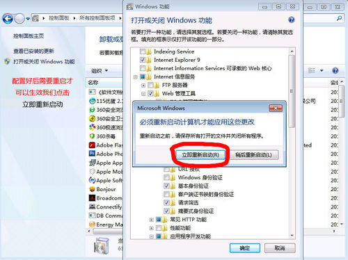 要調試 ASP.net 當然要安裝IIS支持 ASP.net 的組件了。選擇好了后點擊確定就等他安裝好 安裝好組件后需要重啟才能夠工作正常