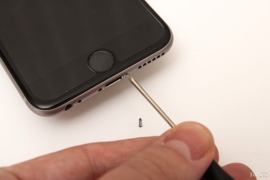 第3步:關(guān)掉手機(jī)電源,使用工具包里的五角形螺絲刀擰下螺絲。螺絲刀的頭部很小,但它跟 iPhone 6底部的小螺絲是匹配的。
