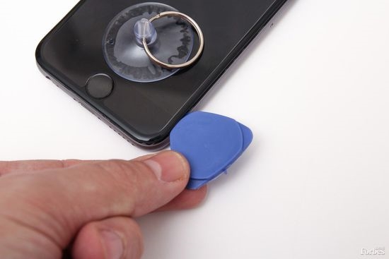 第4步:使用吸盤在主頁鍵(Home)上方拉出屏幕。把吸盤固定在主頁鍵的正上方,另一只手握住機(jī)身,然后往外拉。你只需要在屏幕和機(jī)身之間撬開足以塞進(jìn)一個(gè)塑料片的空間。