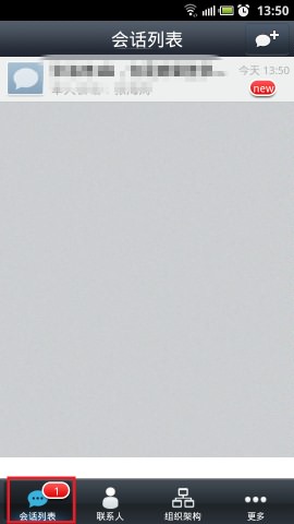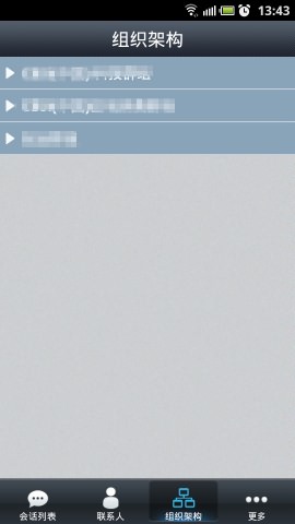 登錄后會看到底部有四個基本功能鍵:會話列表、聯(lián)系人、組織架構(gòu)、更多。