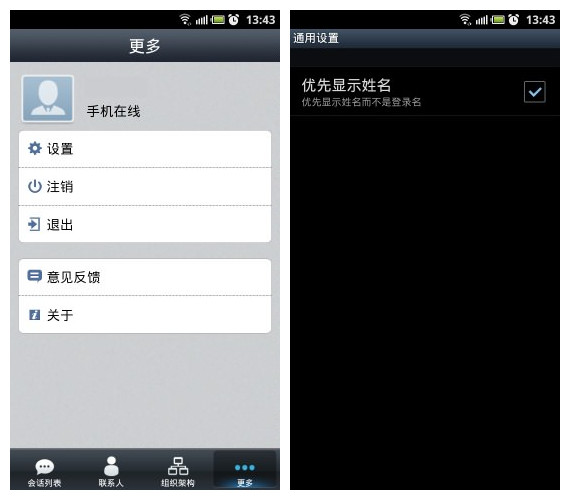而在軟件設(shè)置方面,也就是手機底部的“更多”功能區(qū),及其精簡。只有優(yōu)先顯示姓名及注銷、退出功能。