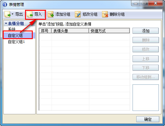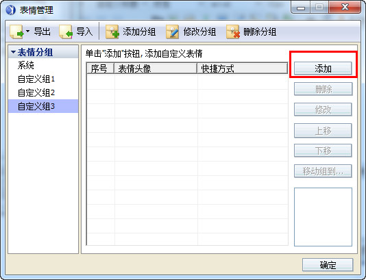 3、在彈出的表情管理中選擇添加分組(系統(tǒng)表情分組是不支持導(dǎo)入表情的,必須添加分組)--添加好分組之后