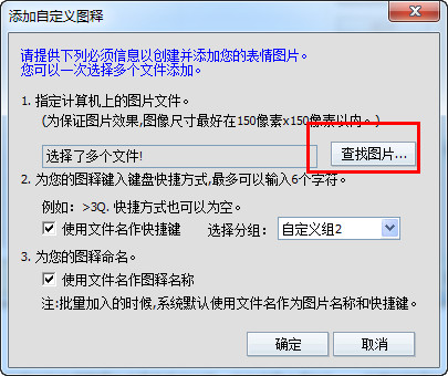 3、點(diǎn)擊“查找圖片”,找到圖片路徑,這里可以選擇多個(gè)圖片——點(diǎn)擊打開——還可以為你的圖片鍵入鍵盤快捷方式,為你的圖釋命名等——完成這些之后點(diǎn)擊確定即可。