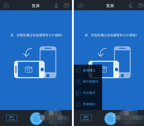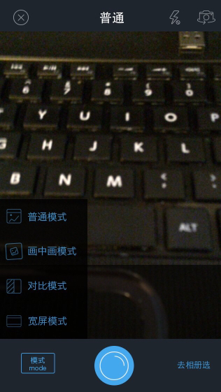 點(diǎn)中間的藍(lán)圈會(huì)有文字、照相和爆料選項(xiàng),選擇照相會(huì)直接出現(xiàn)拍照功能,選左下角里面的橫屏模式,可以直接拍,也可以到相冊中選照片,很方便。