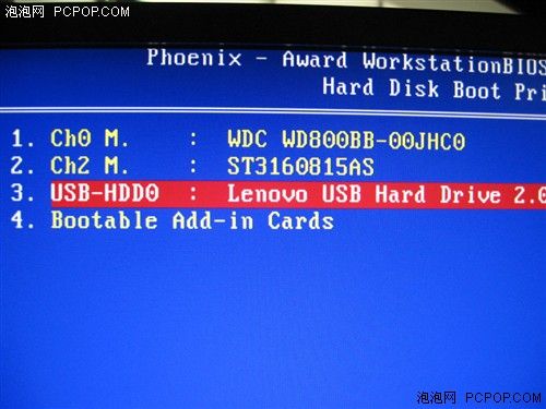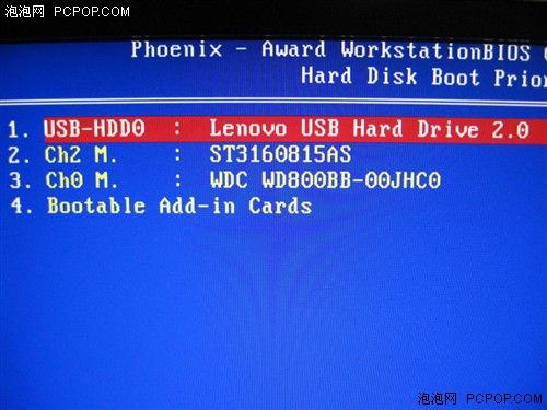 敲擊回車之后,我們會看到如上圖的列表,列表中的USB-HDD0:Lenovo USB Hard Drive 2.0就是我們連接到計算機上的移動硬盤。所以,我們需要將它的位置設為第一個,也就是首先從移動硬盤引導,而不是WDxxxx、STxxxx。