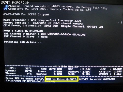 實際上,近幾年的主板廠商特地在設置首引導設備這個過程上添加了一項非常人性化的功能,即可以通過某些特定的功能鍵,直接臨時設置首引導設備。而這些功能鍵對于各大主板廠商是不一定的,但是基本上都是以下4個鍵——ESC、F8、F9、F11,那么這些高手怎么發(fā)現(xiàn)這些秘密的呢?請看下面的三張圖。
