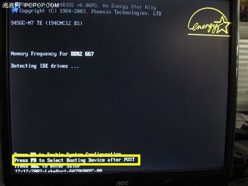 以上是三家不同品牌、不同型號主板在POST期間的屏幕顯示情況,請看筆者用黃色框住的部分,稍微有點英語基礎的人都看得出來,提示的這個鍵一定和Boot(引導)有關。沒錯,屏幕中所出現(xiàn)的這個鍵就是用來臨時改變引導設備的。由于基本上所有的廠商都是定義的這幾個鍵中的一個,所以一些高手在計算機啟動時,直接同時按這幾個鍵,總有一個是對的,所以這就出現(xiàn)了本頁開始的那一幕。