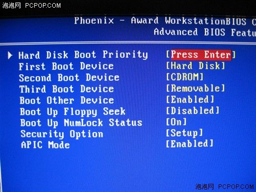 首先,確保上圖中第二行(主板不同,位置不一樣)First Boot Device后面的設置為,也就是首先從硬盤引導。然后在第一行Hard Disk Boot Priority后的上敲回車。在這里設置當你有多個硬盤時,設置具體哪一個硬盤為首先引導的設備。在這里一定要搞清楚和First Boot Device的區(qū)別。