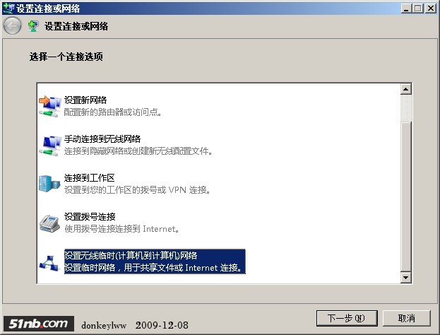 2、用x41t建立主機(jī):打開(kāi)‘網(wǎng)絡(luò)和共享中心’,點(diǎn)擊‘設(shè)置新的連接或網(wǎng)絡(luò)’,如果無(wú)線網(wǎng)卡是活動(dòng)的,則會(huì)在最下邊有一項(xiàng)‘設(shè)置無(wú)線臨時(shí)(計(jì)算機(jī)到計(jì)算機(jī))網(wǎng)絡(luò)’