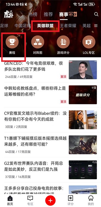 1、在虎撲軟件界面,需要已經(jīng)關(guān)注了英雄聯(lián)盟這個(gè)項(xiàng)目之后才能看到,如果已經(jīng)關(guān)注了,可以在首頁(yè)界面中點(diǎn)擊上方的【賽事】;
